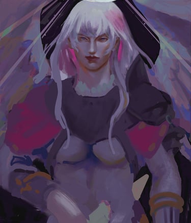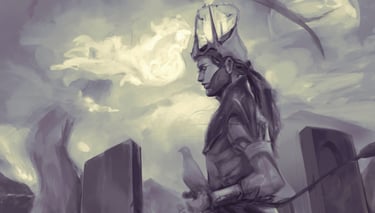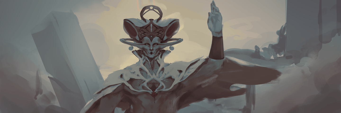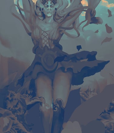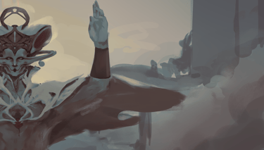 In "Far May They Reign," the remnants of divinities, narrowly escaping The Schism, slowly rebuild order. From a mortal viewpoint, this art presents these entities with exaggerated scale and an almost desperate reverence for some greater and many lesser cosmic entities.